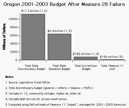 "Add to this the fifty million allotted annually for new prison construction, and Measure 11's cost becomes equivalent to nearly a third of the Department of Corrections budget."